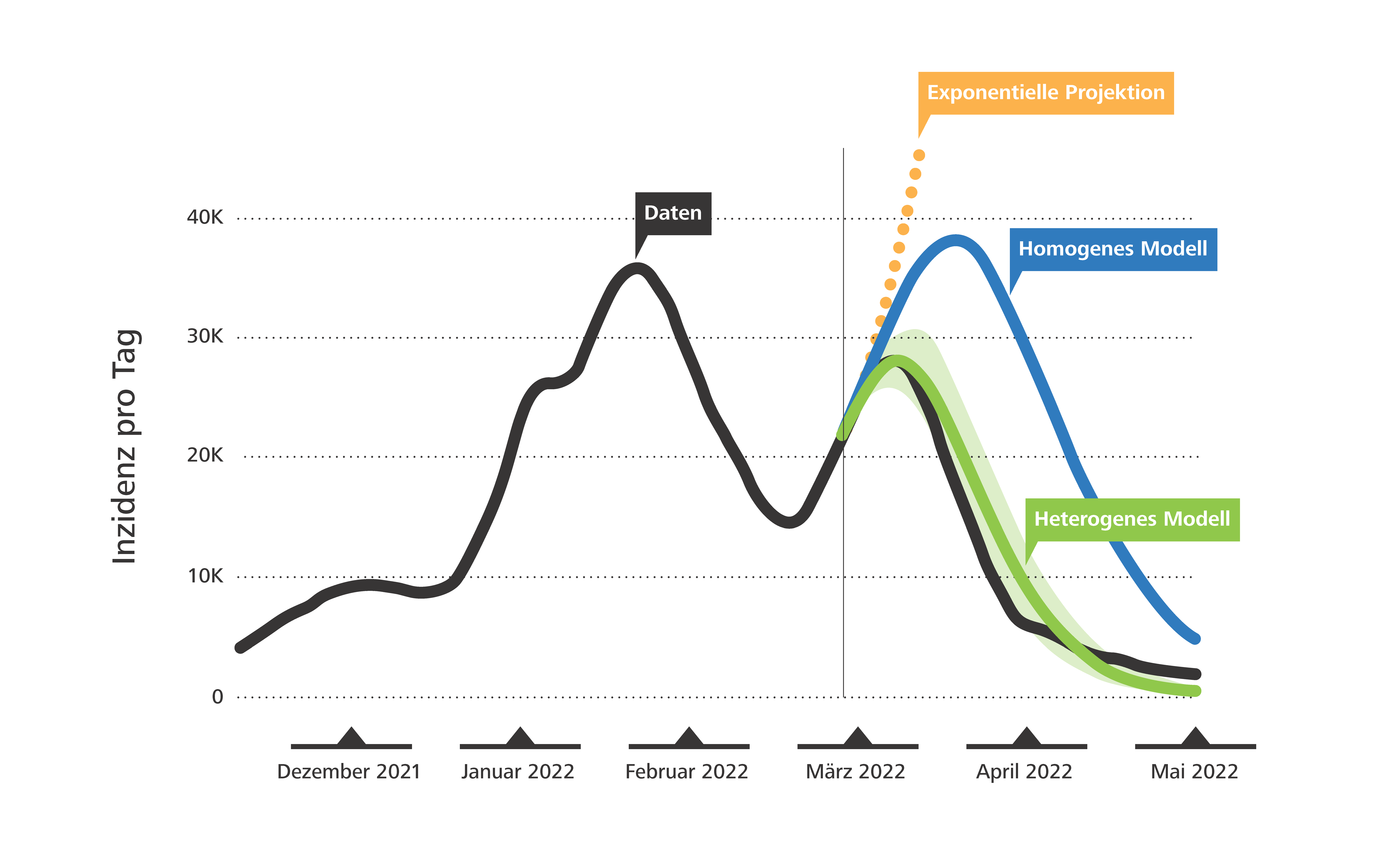 Diese Infektionskurve lässt sich mit mathematischen Methoden berechnen, um ihren Peak vorherzusagen. Geht man dabei von der Annahme aus, dass jede infizierte Person gleich viele andere Menschen ansteckt, weicht das Modell jedoch von den empirisch gemessenen Infektionswellen ab. Zwar kann es den Beginn der Welle gut wiedergeben, im späteren Verlauf ebbt die Infektionswelle jedoch schneller ab als vorhergesagt jedoch schneller als vorhergesagt, sodass der Peak schlussendlich etwas tiefer ausfällt als in der Modellrechnung – und zwar selbst dann, wenn keine neuen Schutzmassnahmen den Infektionsverlauf beeinflussen.