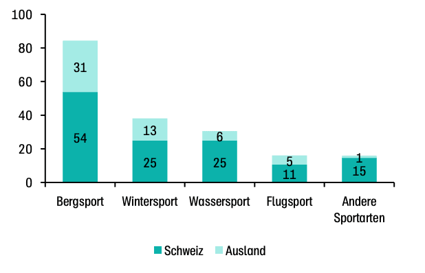 Over the past 24 years, an average of 185 people have died in sports-related accidents in Switzerland every year, including 56 foreign guests. 84 of these died while practising mountain sports, followed by snow sports (38) and water sports (31).