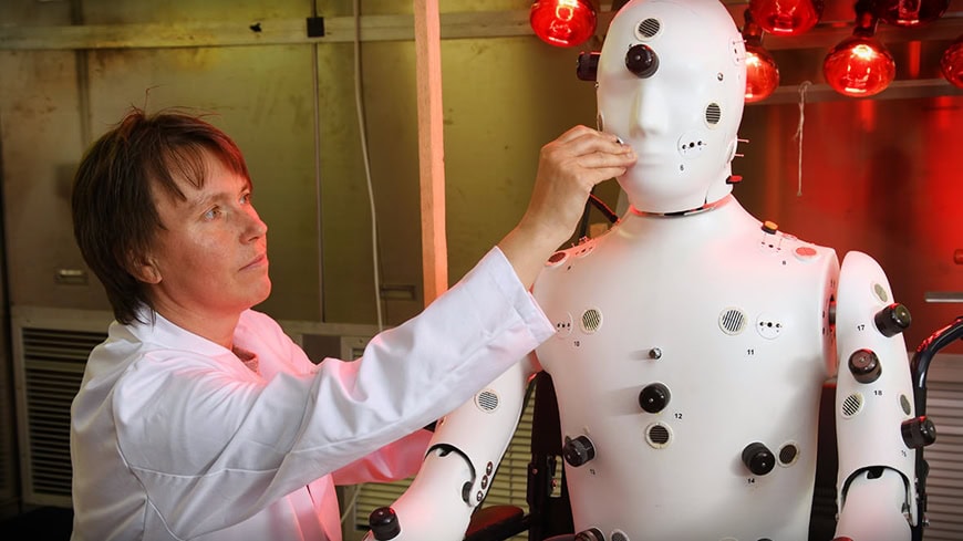 The futuristic-looking "HVAC", short for "Heating, Ventilation, Air Conditioning", is well equipped: However, sensors for air temperature, humidity and air movement alone are not enough. A total of 46 measuring fields break through the plastic shell of the manikin, which it uses to quantify the heat radiation from the environment and, for example, to differentiate between solar heat and heating air.
