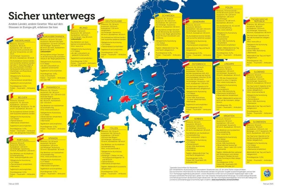 Failure to comply with these regulations can lead to fines or impair safety while driving. For this reason, the Touring Club Switzerland (TCS) provides drivers with a map showing the relevant regulations in the individual countries. The TCS also recommends a vehicle check before departure to avoid breakdowns, especially during the busy summer travel season.
