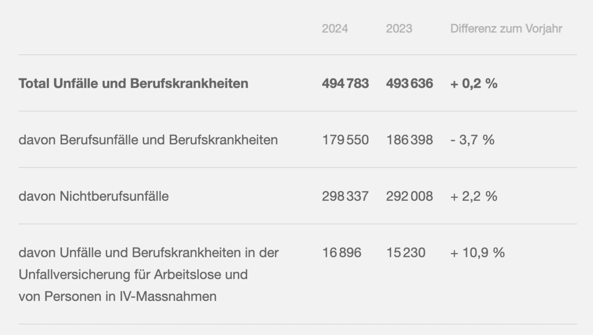 As Switzerland's largest accident insurer, Suva insures around half of all working people against accidents and occupational illnesses. Around 495,000 cases were reported to Suva in 2024. The overall difference compared to the previous year is small. The proportion of accidents at work continued to fall. In leisure time, most accidents occurred while playing football, skiing and biking/mountain biking. Many accidents can be avoided with active prevention.