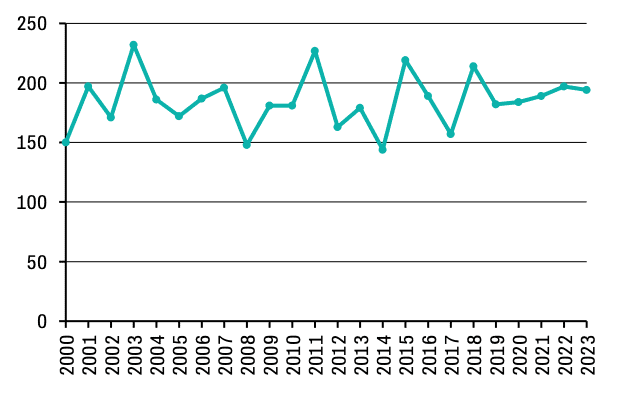 Evolution du nombre de tués dans la pratique d'un sport (pays d'accidents : Suisse), 2000-2023