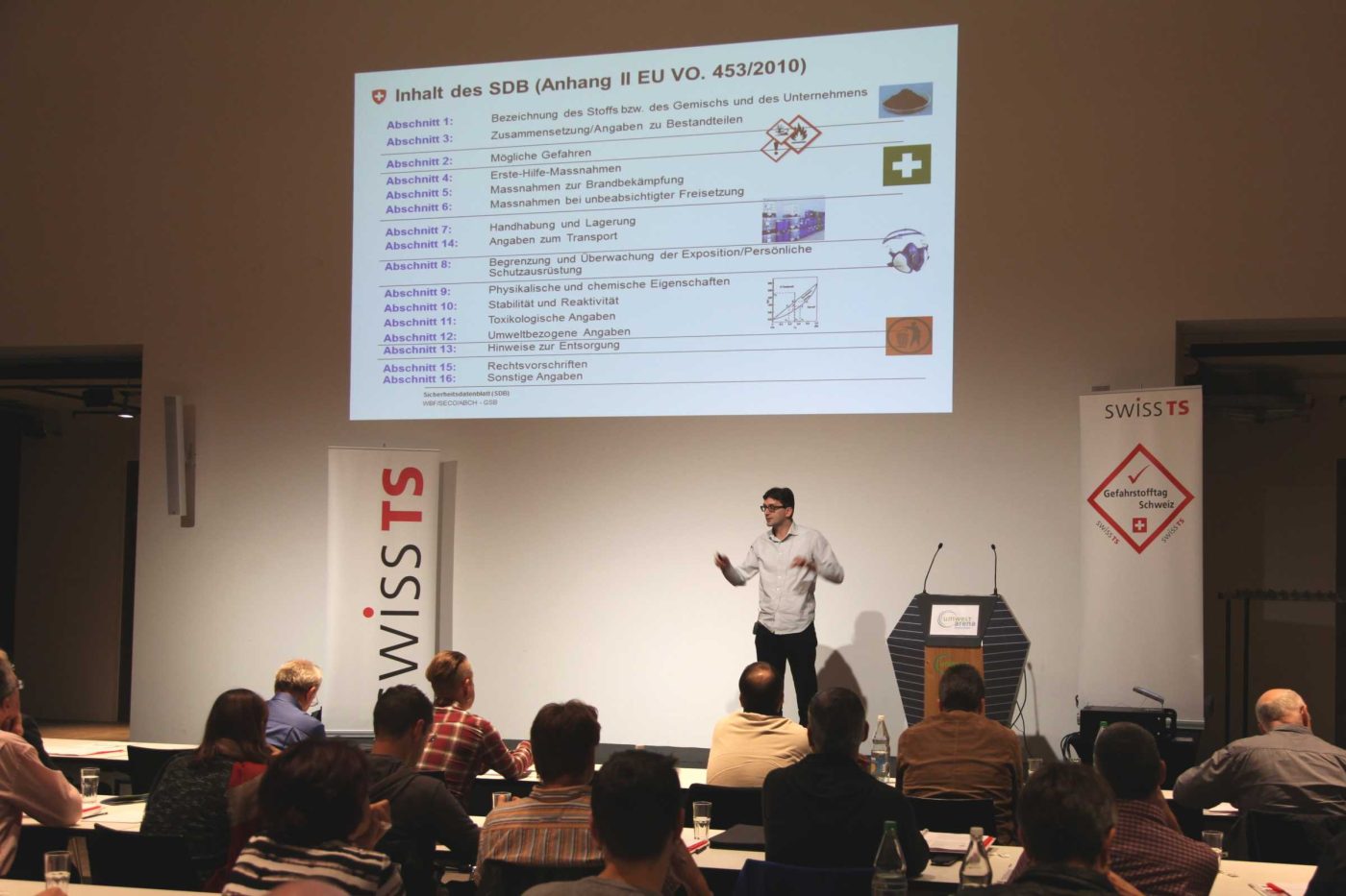 Un atelier a également permis de répondre aux questions individuelles des participants. Matthias Mettke, organisateur de la journée et expert en matières dangereuses de Swiss TS, a répondu aux questions et aux préoccupations de l'assemblée : à partir de quand un produit doit-il être notifié à l'OFSP, a-t-on besoin d'une FDS avec un nouvel étiquetage même pour des produits déjà utilisés, sommes-nous encore soumis à l'ordonnance sur les accidents majeurs, pouvons-nous réécrire et compléter nous-mêmes une FDS, qu'est-ce qui est utile et qu'est-ce qui est légal, les pictogrammes peuvent-ils être uniquement noirs et où conserver au mieux une FDS ?