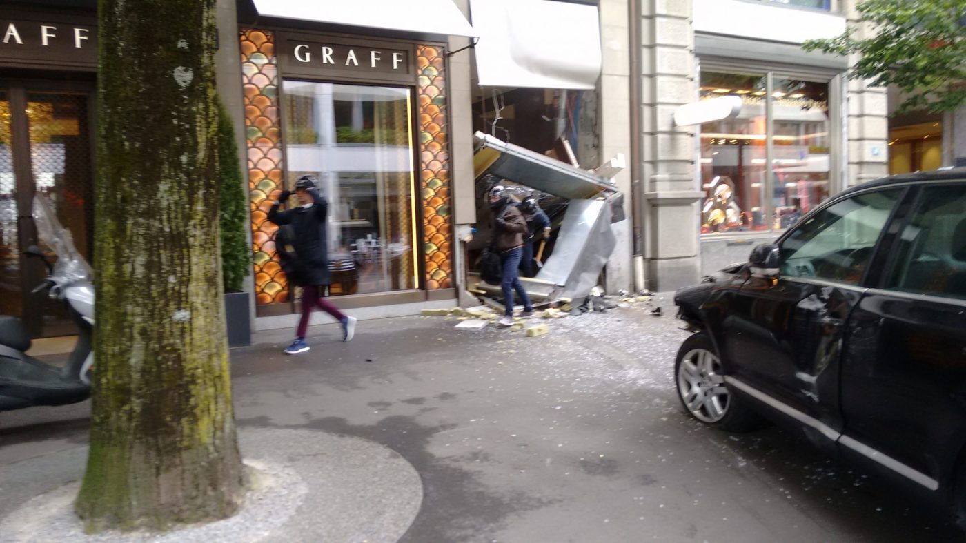 Le samedi matin 28 mai 2016, des inconnus ont foncé avec une voiture contre la vitrine d'une bijouterie de la Bahnhofstrasse 16, en ville de Zurich, de sorte que celle-ci s'est brisée. Quatre personnes ont ensuite pris la fuite avant l'arrivée de la police. La police publie des photos des auteurs et recherche des témoins.