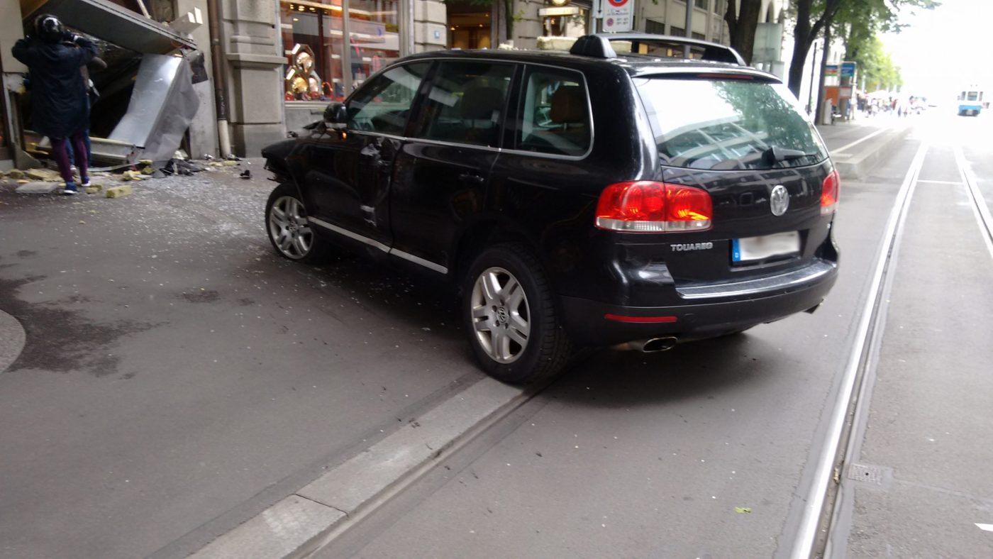 Sabato mattina, 28 maggio 2016, ignoti hanno guidato un'auto contro la vetrina di una gioielleria in Bahnhofstrasse 16 nella città di Zurigo, provocandone la rottura. In seguito, quattro persone sono fuggite prima dell'arrivo della polizia. La polizia ha pubblicato le foto degli autori e sta cercando testimoni.