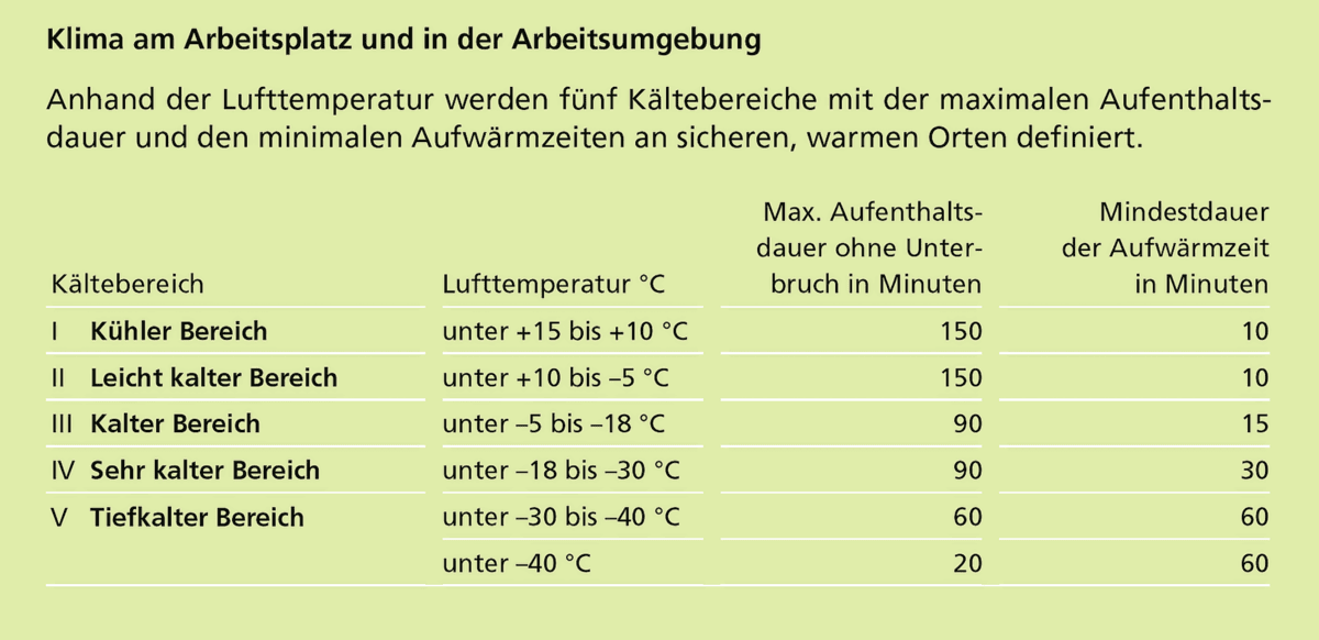 In caso di temperature estremamente basse, i datori di lavoro devono assicurarsi che i dipendenti abbiano regolarmente la possibilità di ritirarsi in sale ricreative riscaldate. Nel settore edile, in particolare, esistono chiari requisiti legali che impongono che tali locali siano protetti dalle intemperie e riscaldati per consentire ai dipendenti di fare una pausa a una temperatura di almeno 21°C.