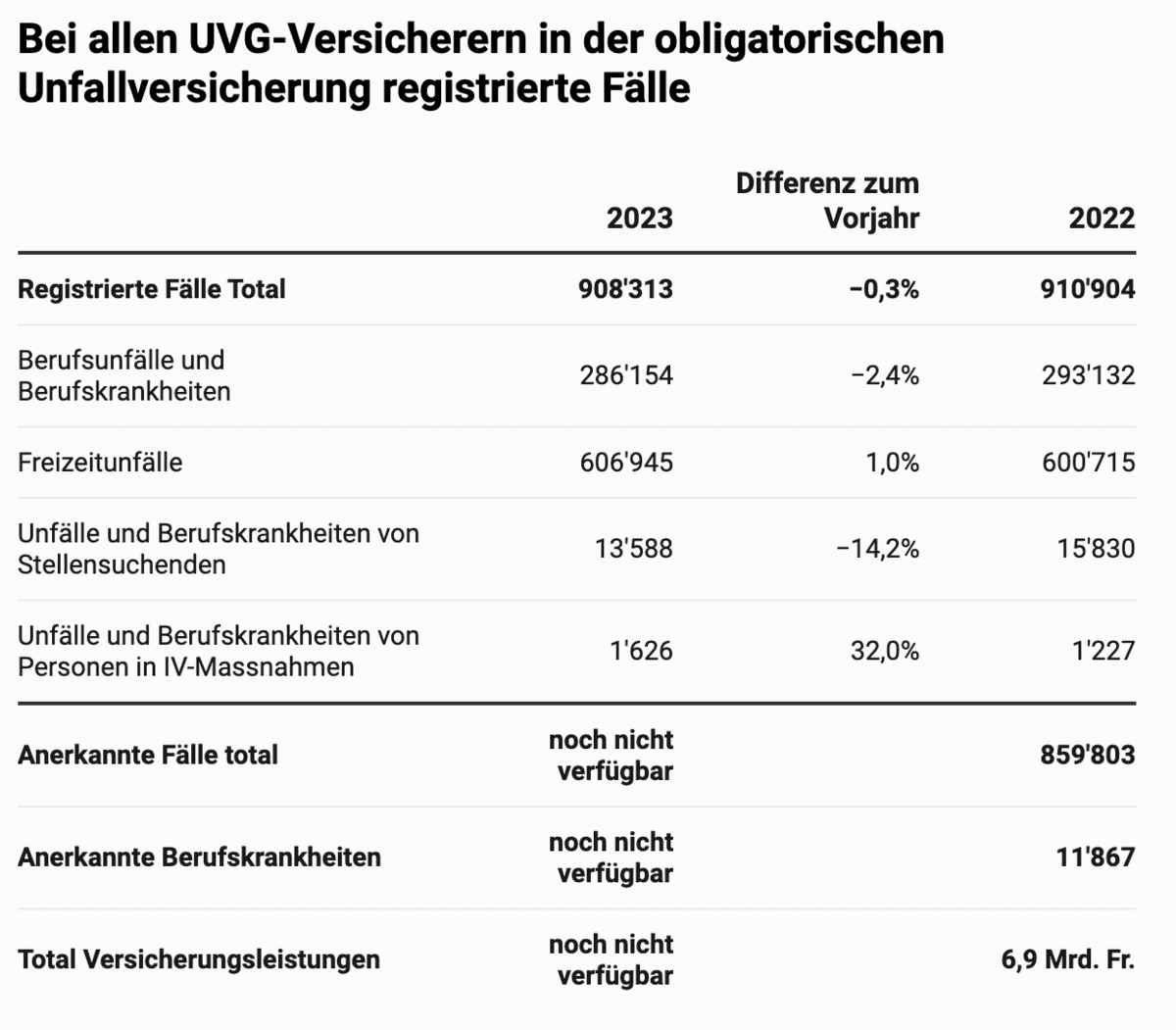 Nel 2023 sono stati denunciati ai 22 assicuratori svizzeri contro gli infortuni (LAINF) circa 908.000 infortuni professionali e del tempo libero e malattie professionali. Mentre gli infortuni professionali sono leggermente diminuiti rispetto all'anno precedente, quelli del tempo libero sono leggermente aumentati. Nel complesso, i casi e i costi sono rimasti al livello dell'anno precedente. La statistica degli infortuni di quest'anno si concentra sul confronto tra gli assicurati della Suva e quelli degli altri assicuratori.